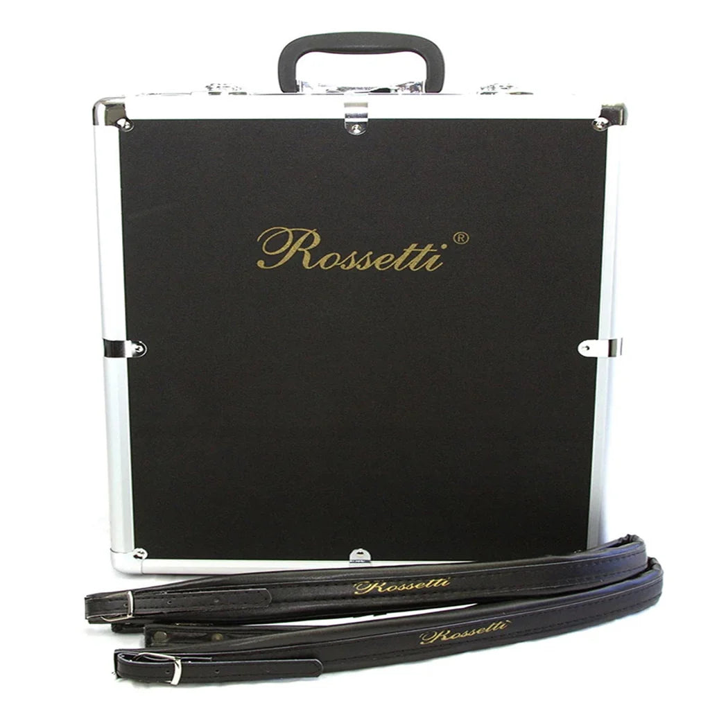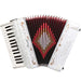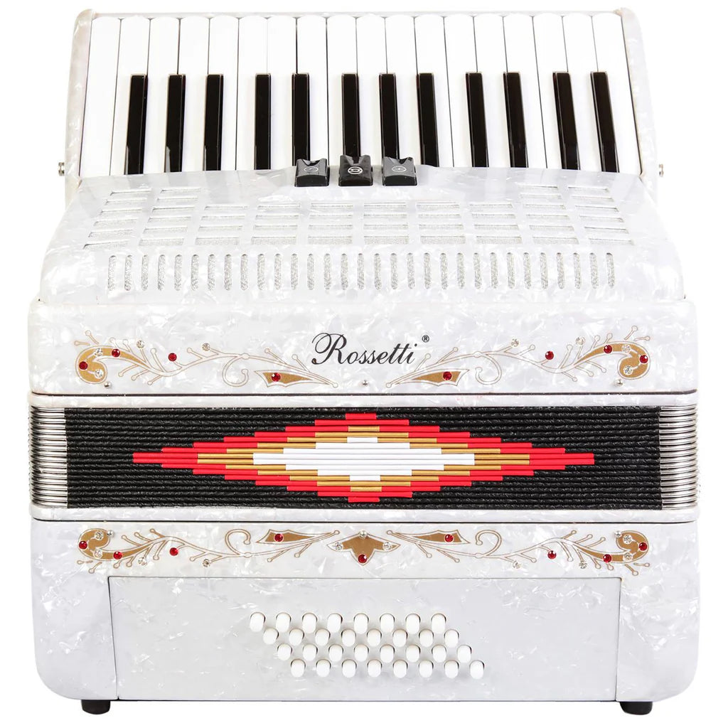 This beautiful accordion with Italian style decorations and bright pearlescent finish comes in several colors. It has 30 keys, 18 white and 12 black keys. The keyboard treble side starts on G and ends on C (two octaves). There are three sound switches, clarinet, tremolo and master. All produce a full rich sound. The bass side has 32 chords. Also included are bellows straps adjustable left-hand straps. Two Straps in and a locking hard case.